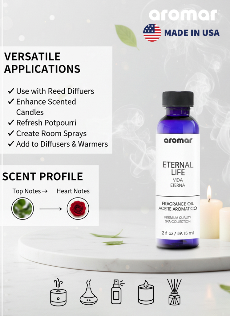 Awaken your senses and rejuvenate your spirit with Aromar Spa Eternal Life Aromatic Oil (59.15ml) a pure, revitalizing fragrance crafted to bring peace, balance, and renewal into your space. Inspired by the essence of eternal freshness and spiritual calm, this unique scent combines clean floral notes, gentle musk, and soothing woods to create an atmosphere of harmony and clarity. Perfect for meditation, yoga, or daily relaxation, Eternal Life uplifts the mood, cleanses the air, and helps restore inner balance. Its long-lasting, spa-grade aroma transforms any space into a sanctuary of stillness and serenity.
