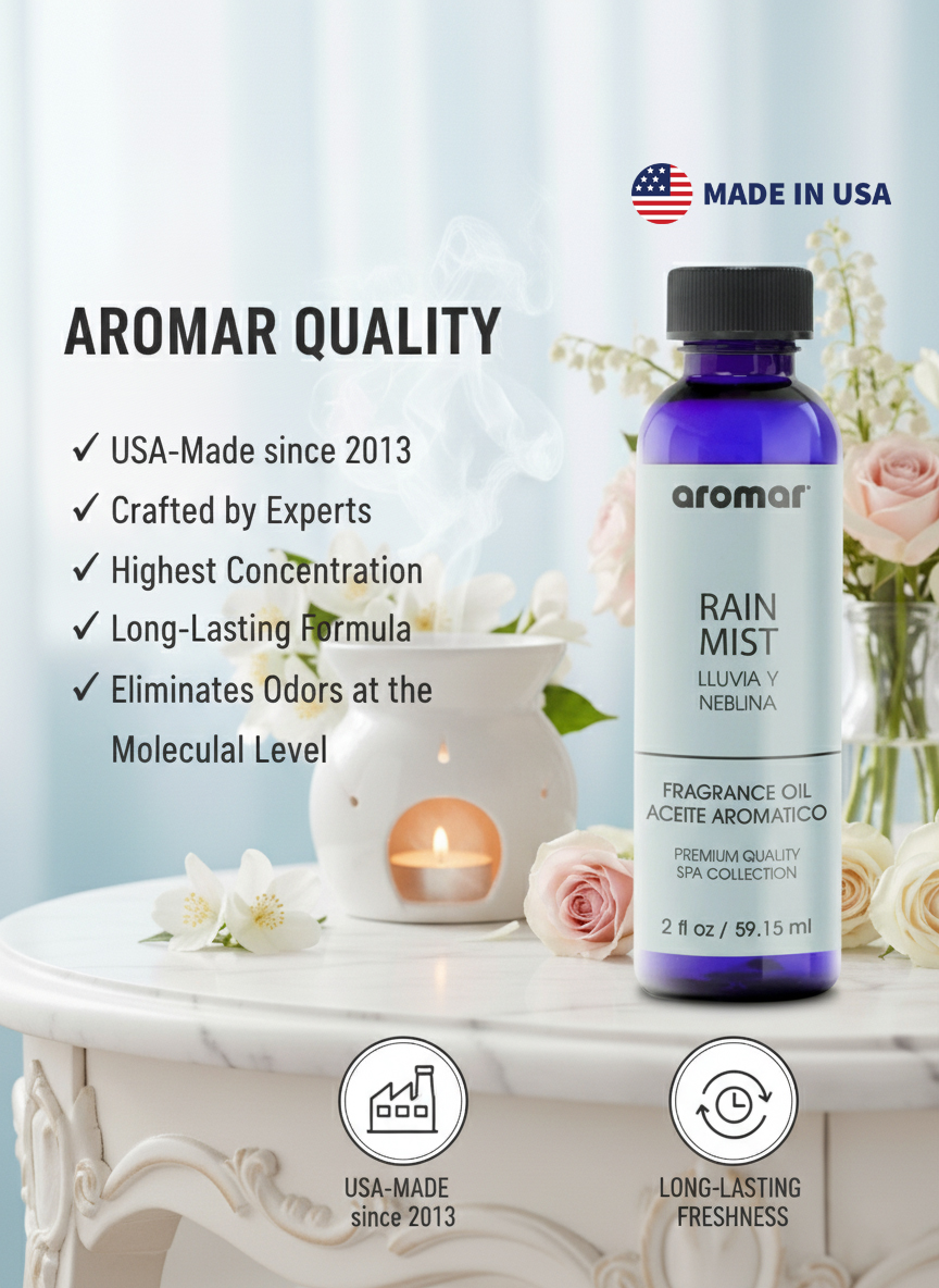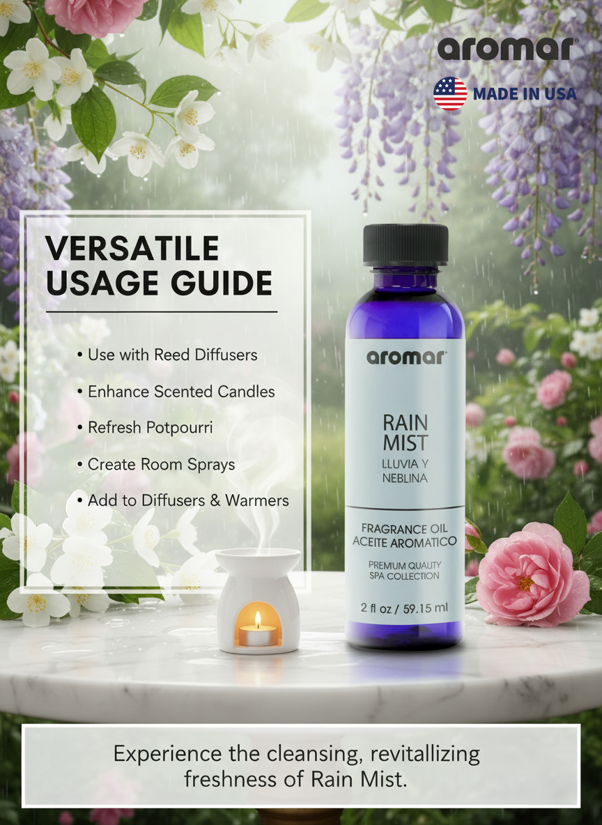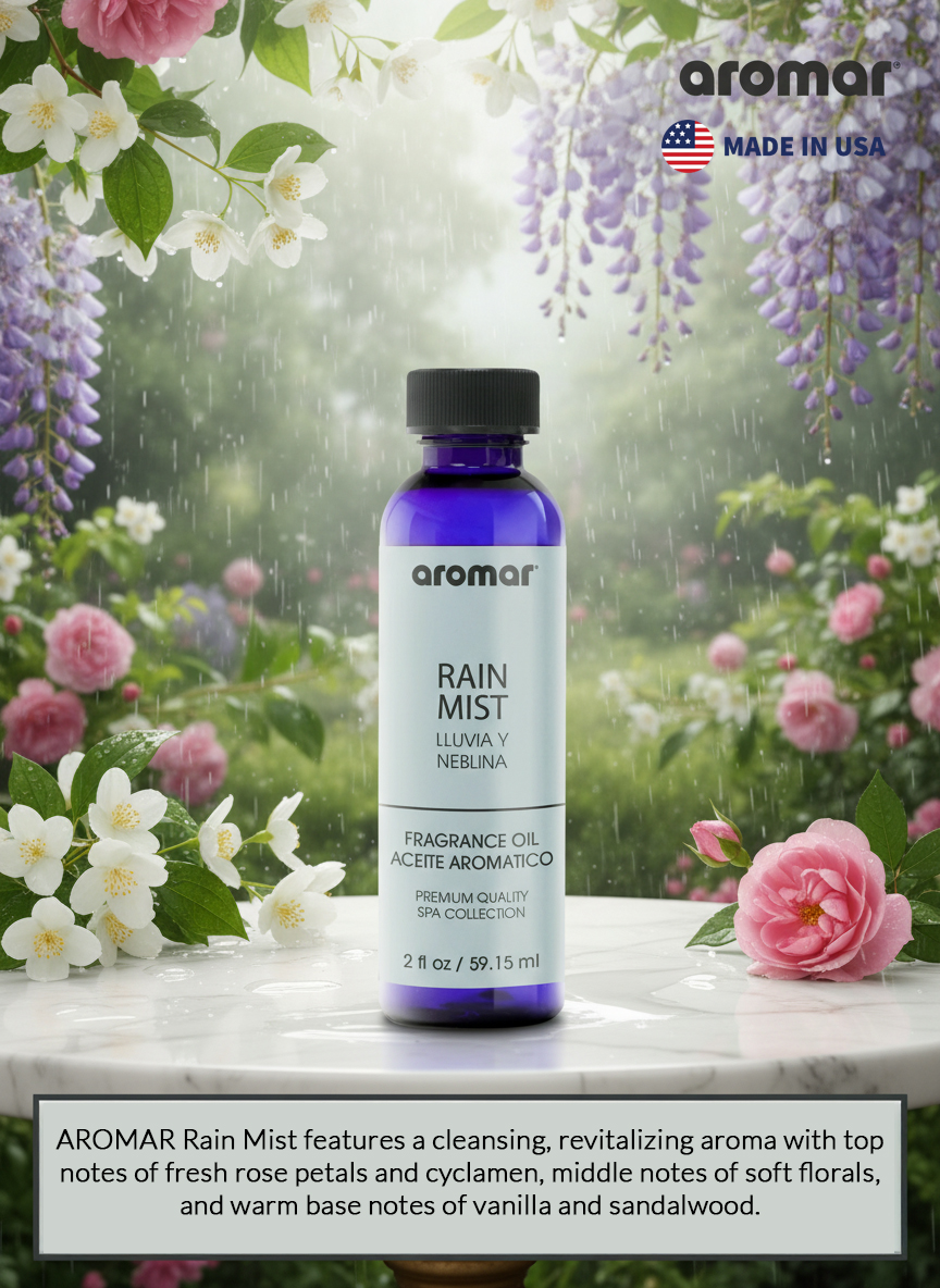 Experience the refreshing calm of a gentle rain shower with Aromar Spa Rain Mist Aromatic Oil (59.15ml). Inspired by natures purest moments, this fragrance captures the crisp scent of rain-soaked air, cool breeze, and dewy leavesbringing an instant sense of clarity and serenity to your surroundings. Formulated with premium-grade aromatic ingredients, Rain Mist delivers a clean, long-lasting freshness that transforms any space into a peaceful retreat. Ideal for diffusers, humidifiers, oil burners, and potpourri, this fragrance oil lets you enjoy the soothing embrace of nature all day long. Whether you want to refresh your mood, deodorize your space, or simply reconnect with nature, Aromar Spas Rain Mist fragrance is your perfect everyday escape.