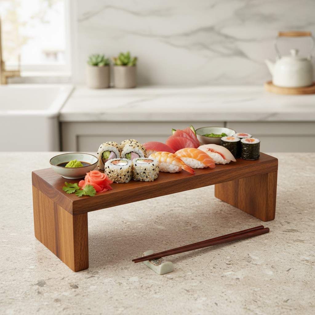 Billi Acacia Wood Footed Sushi Board 35x12x10CM Premium Wooden Serving Platter with Raised Stand, Brown