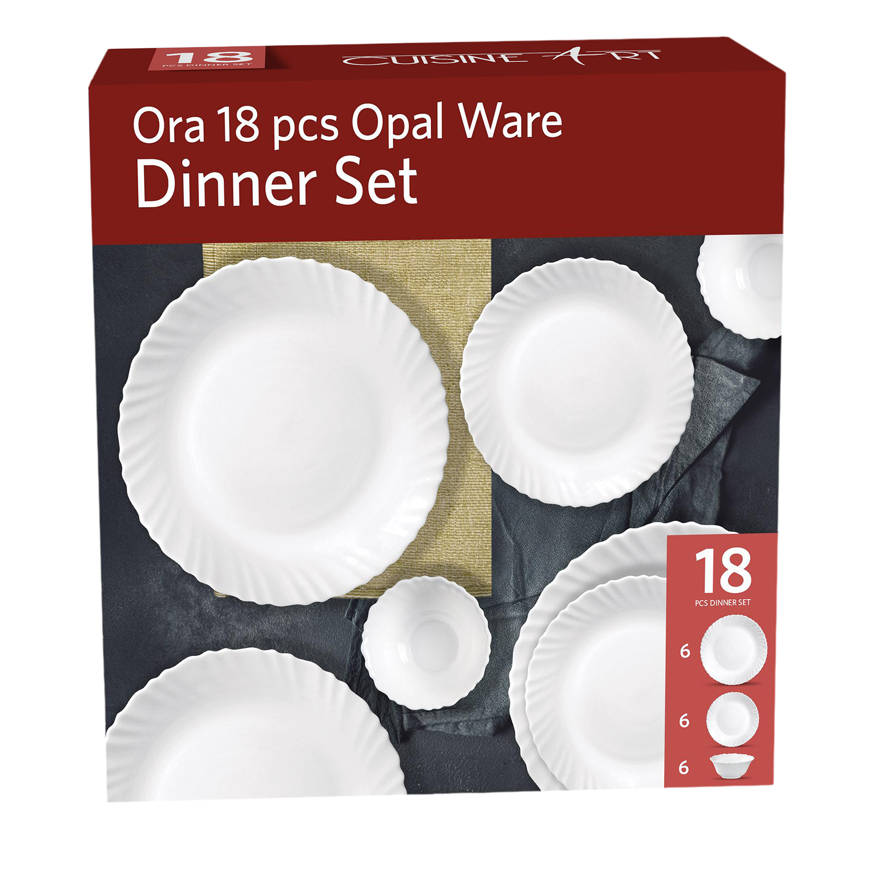 Cuisine Art ORA 18-Piece Opalware Dinner Set, White | Durable Lightweight Opal Glass Crockery | Classique Design | 6 Full Plates, 6 Quarter Plates, 6 Soup Bowls | Microwave & Dishwasher Safe