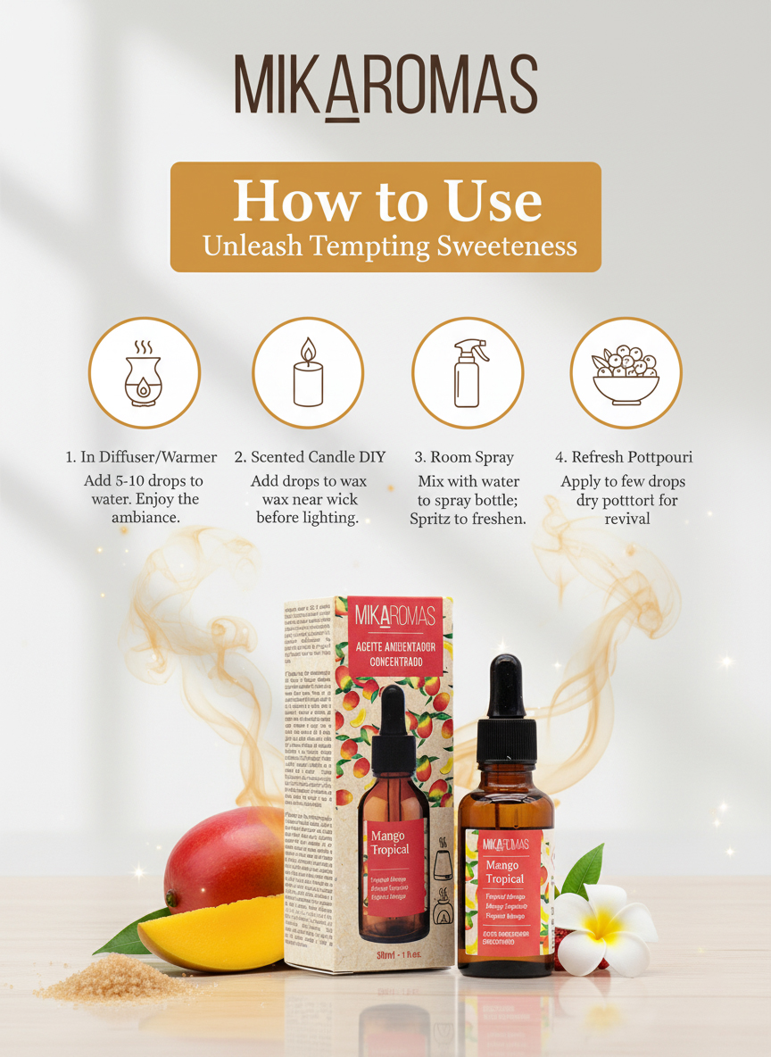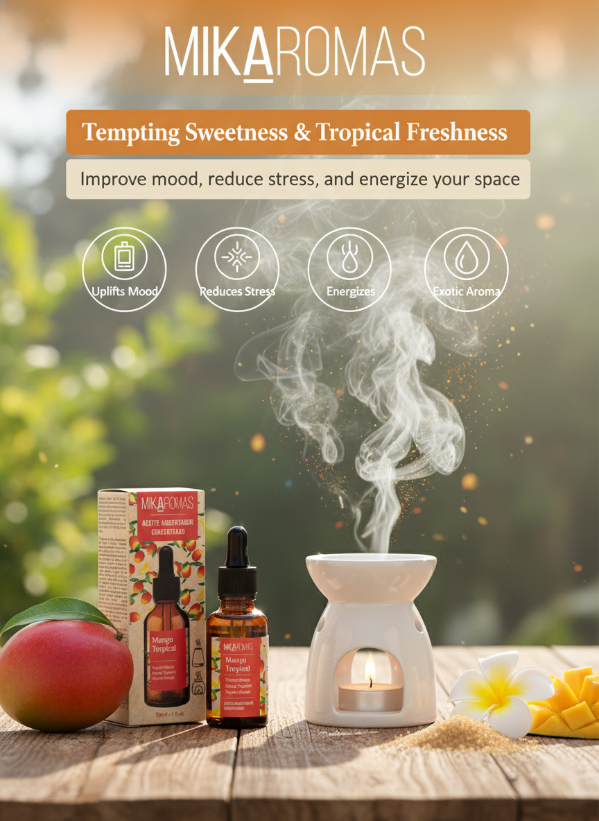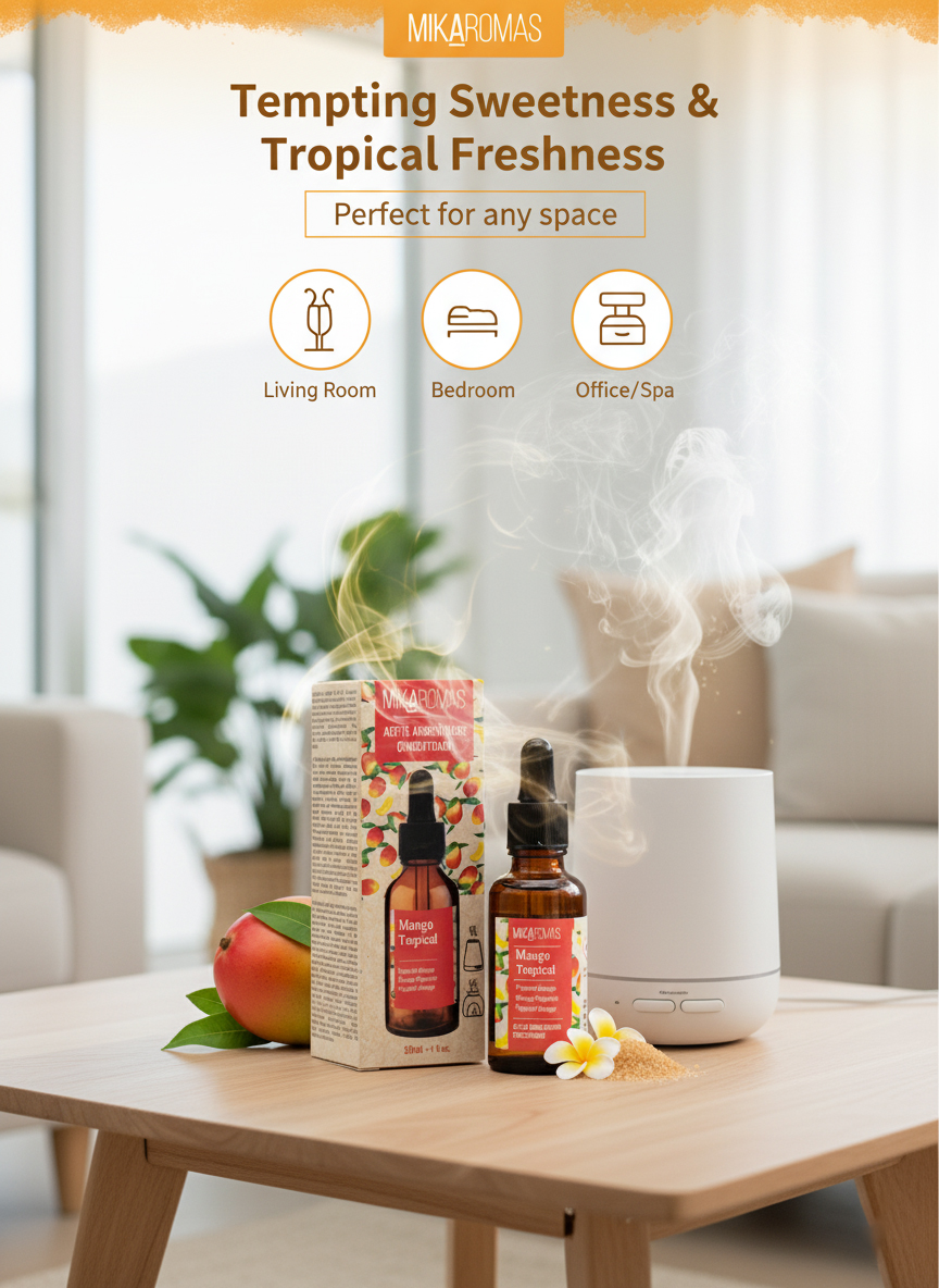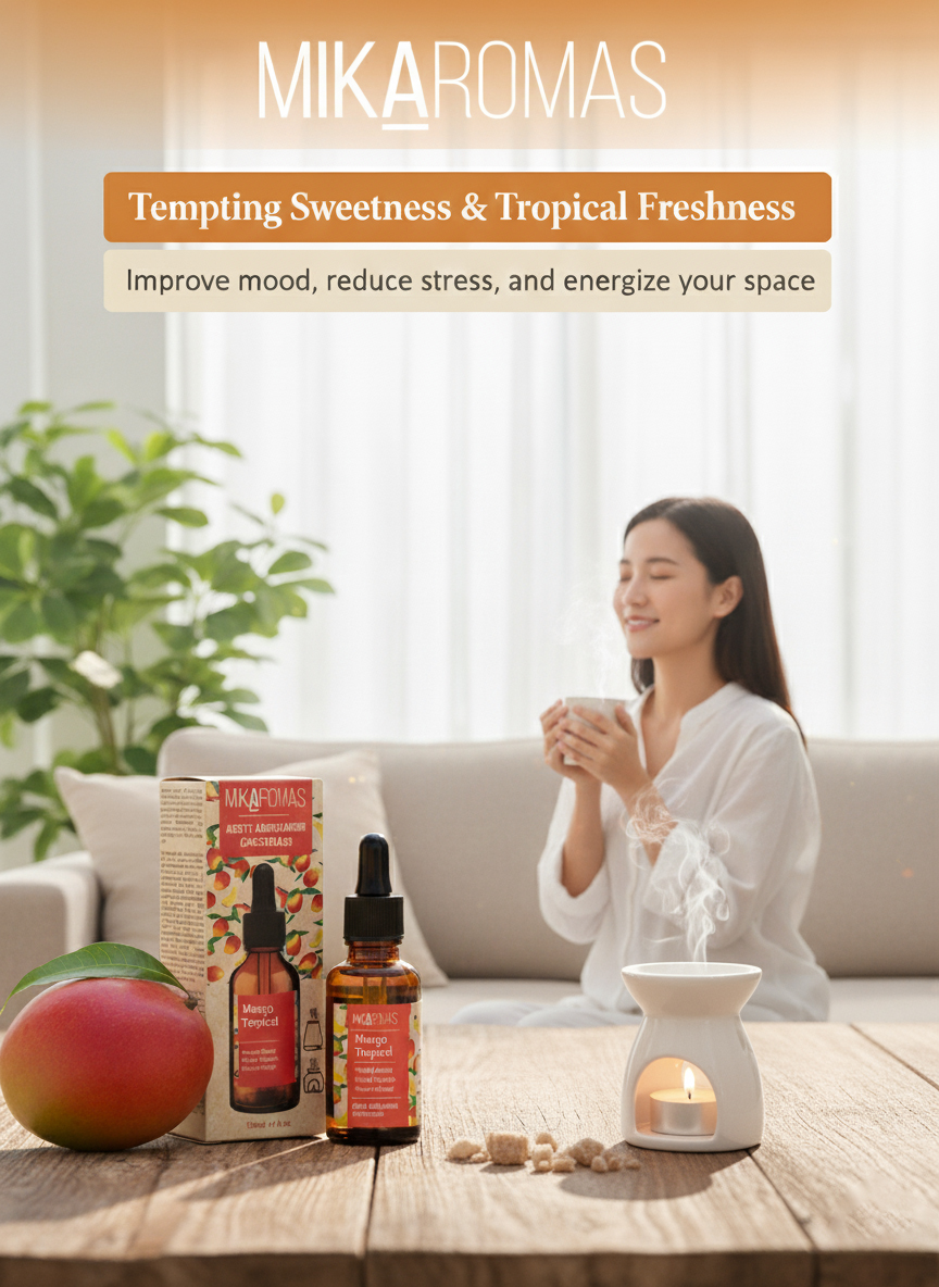 Exotic Tropical Mango Aroma: A fruity, sweet, and juicy scent inspired by freshly sliced mangoes – energizing and uplifting.