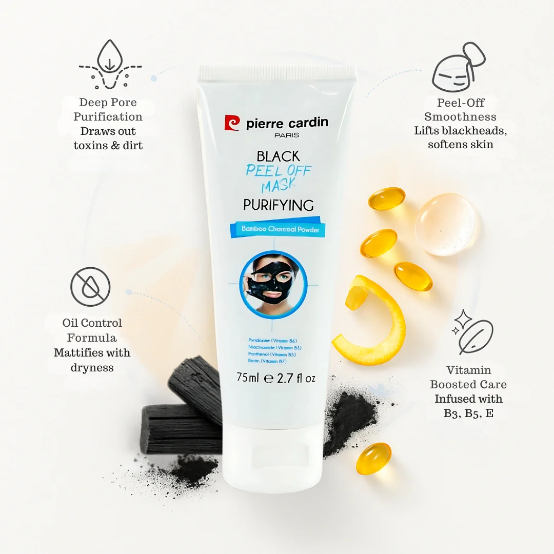 Experience professional skincare at home with the Pierre Cardin Paris Black Peel Off Mask, infused with Bamboo Charcoal Powder and essential vitamins (B3, B5, B6, B7) to deeply cleanse and purify your skin. This advanced formula removes blackheads, whiteheads, and dirt from clogged pores while gently exfoliating the skin for a visibly clearer, smoother, and brighter complexion. The activated charcoal acts like a magnet to draw out toxins and impurities, while Niacinamide (Vitamin B3) and Panthenol (Vitamin B5) help refine pores and maintain skin hydration. Biotin and Pyridoxine nourish and revitalize, leaving your skin fresh, clean, and glowing after every use.Perfect for all skin types, especially oily and acne-prone skin. Reveal detoxified, smooth, and refreshed skin with the power of Pierre Cardin Paris.