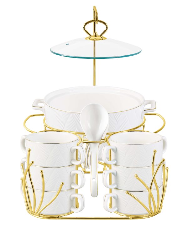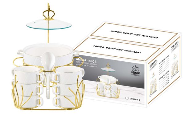 Shallow Amir 16 Piece Soup Set with Gold Stand – Elegant White Porcelain