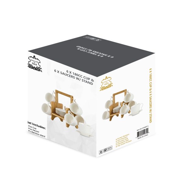 Shallow Elegant Porcelain Bamboo 6 Cup & 6 Saucer Set with Stand, 180ml, White & Brown