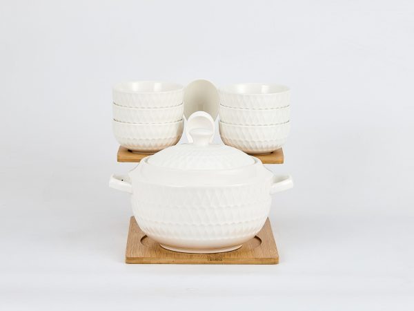 Shallow Porcelain Bamboo 1 Soup Pot, 1 Soup Spoon, 6 Bowls & 6 Spoons with Stand, White & Brown