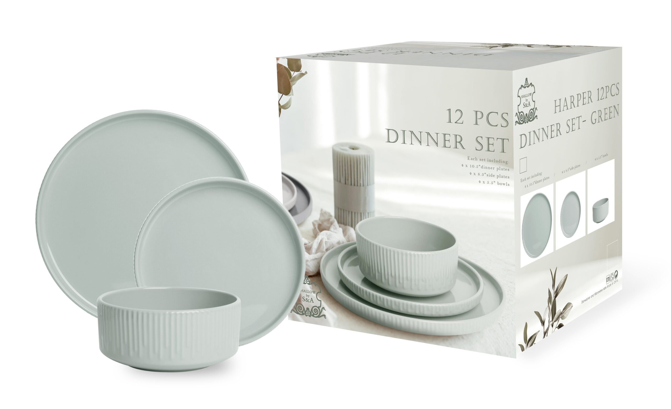 Transform your dining table with the Shallow Stoneware HARPER 12-Piece Dinner Set in Elegant Green, a perfect blend of Nordic minimalism, durability, and sophistication. Designed for modern households, this premium crockery set combines style and practicality, making it suitable for both everyday meals and special occasions. This versatile set includes 4 large dinner plates (10.5), 4 side plates (7.5), and 4 deep bowls (5.5), offering the ideal combination for family dining. Whether youre serving main courses, appetizers, soups, or desserts, the HARPER set ensures every meal is presented beautifully.