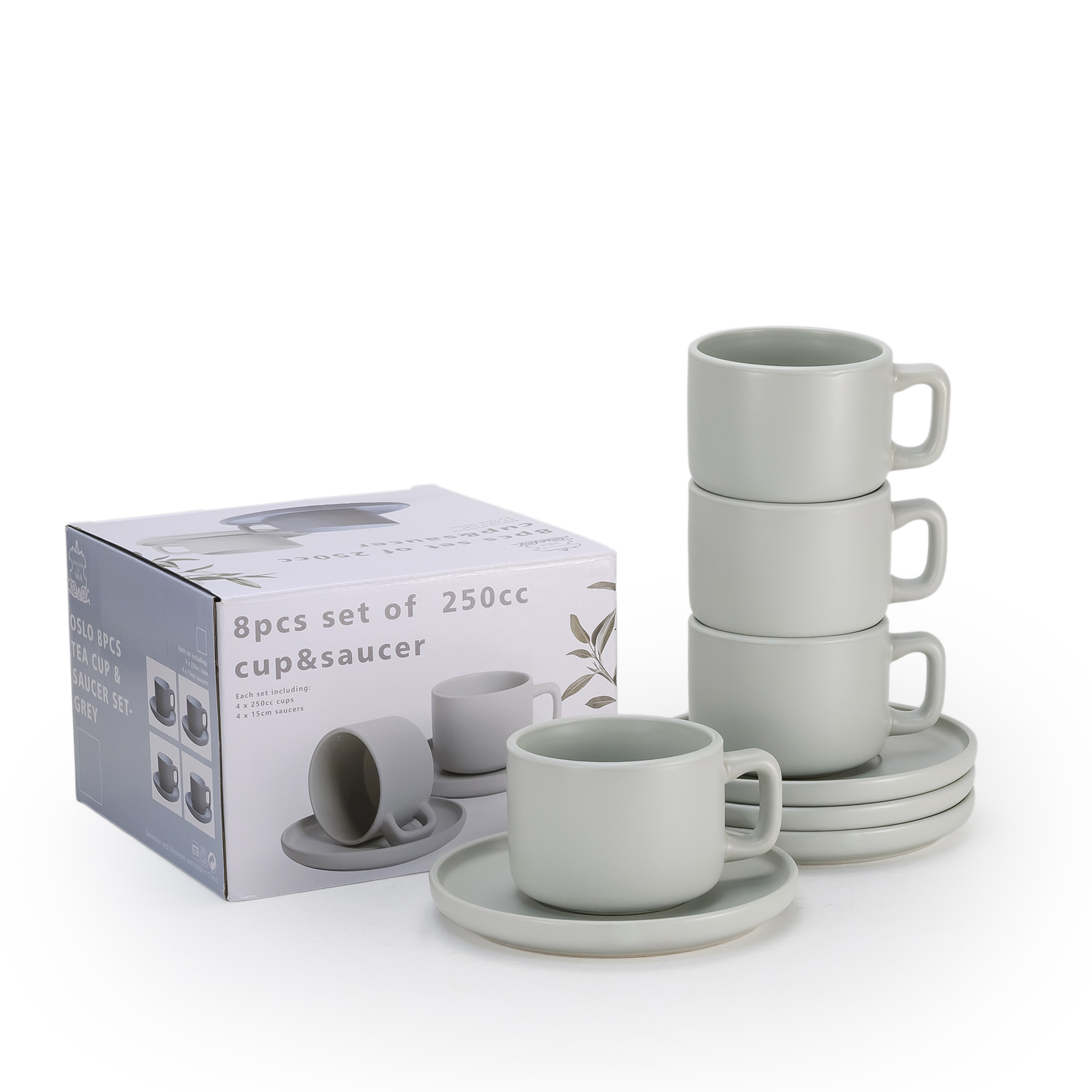 Shallow Stoneware OSLO 8-Piece Tea Cup & Saucer Set-250ml – Elegant Green Nordic Style CeramicCrockery| 4×250ml Tea Cups & 4×Matching Saucers