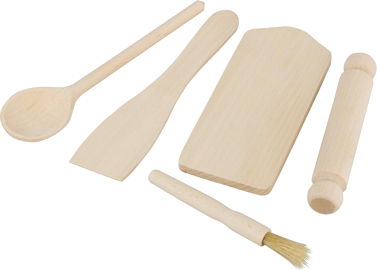 Set contains a wooden spoon, spatula, pastry brush, rolling pin and chopping board