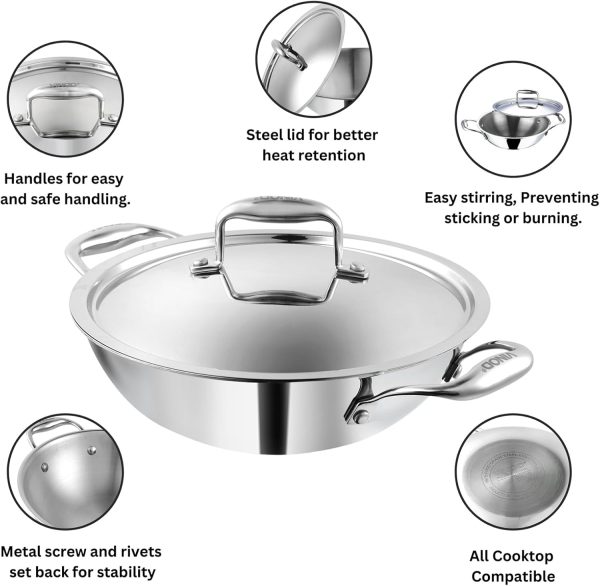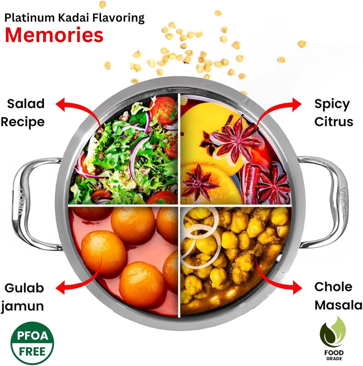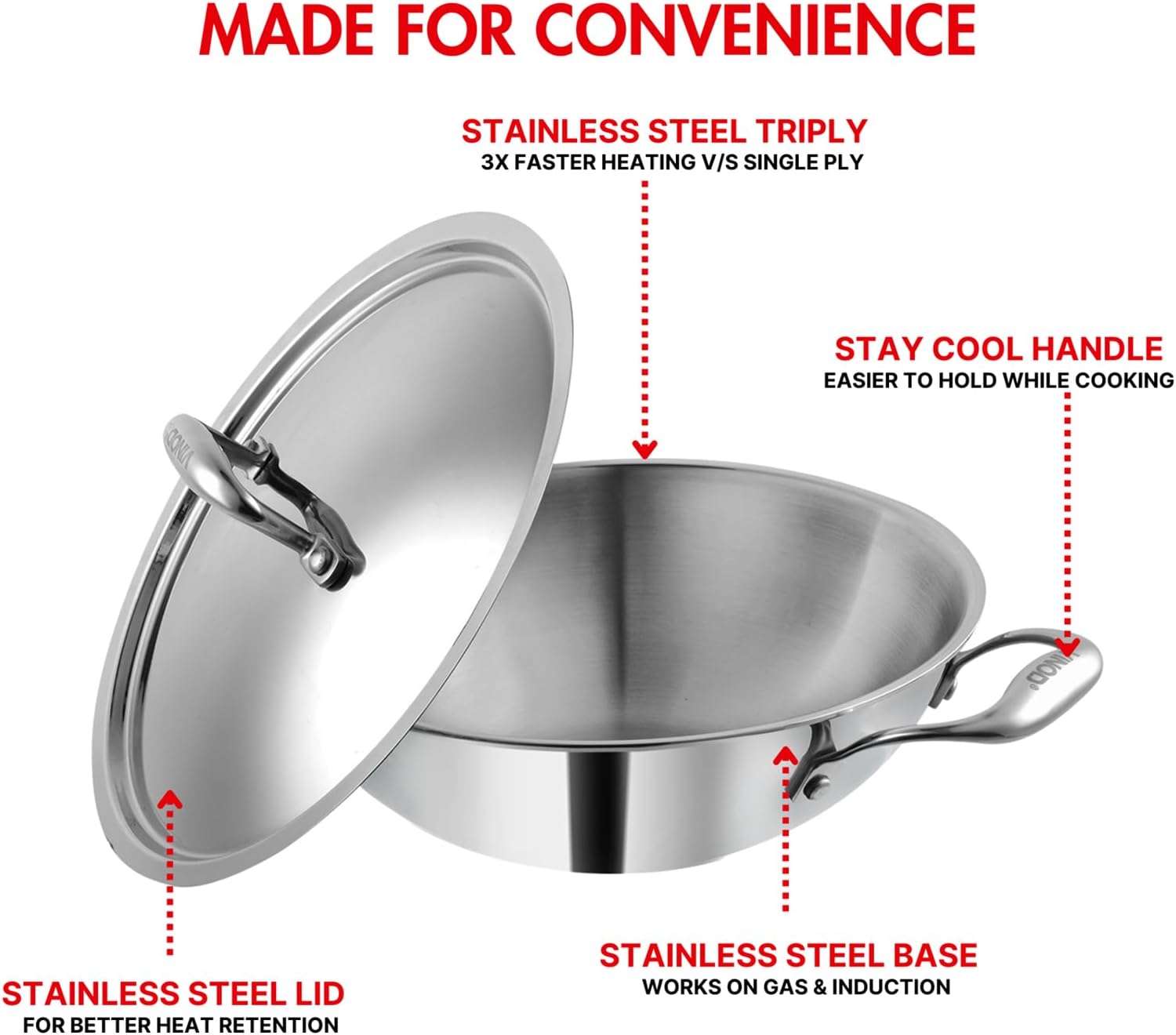 Vinod Platinum Triply Stainless Steel Kadai with Lid – 28 cm, 3.7 L (Induction Friendly, 2.5mm Thick)